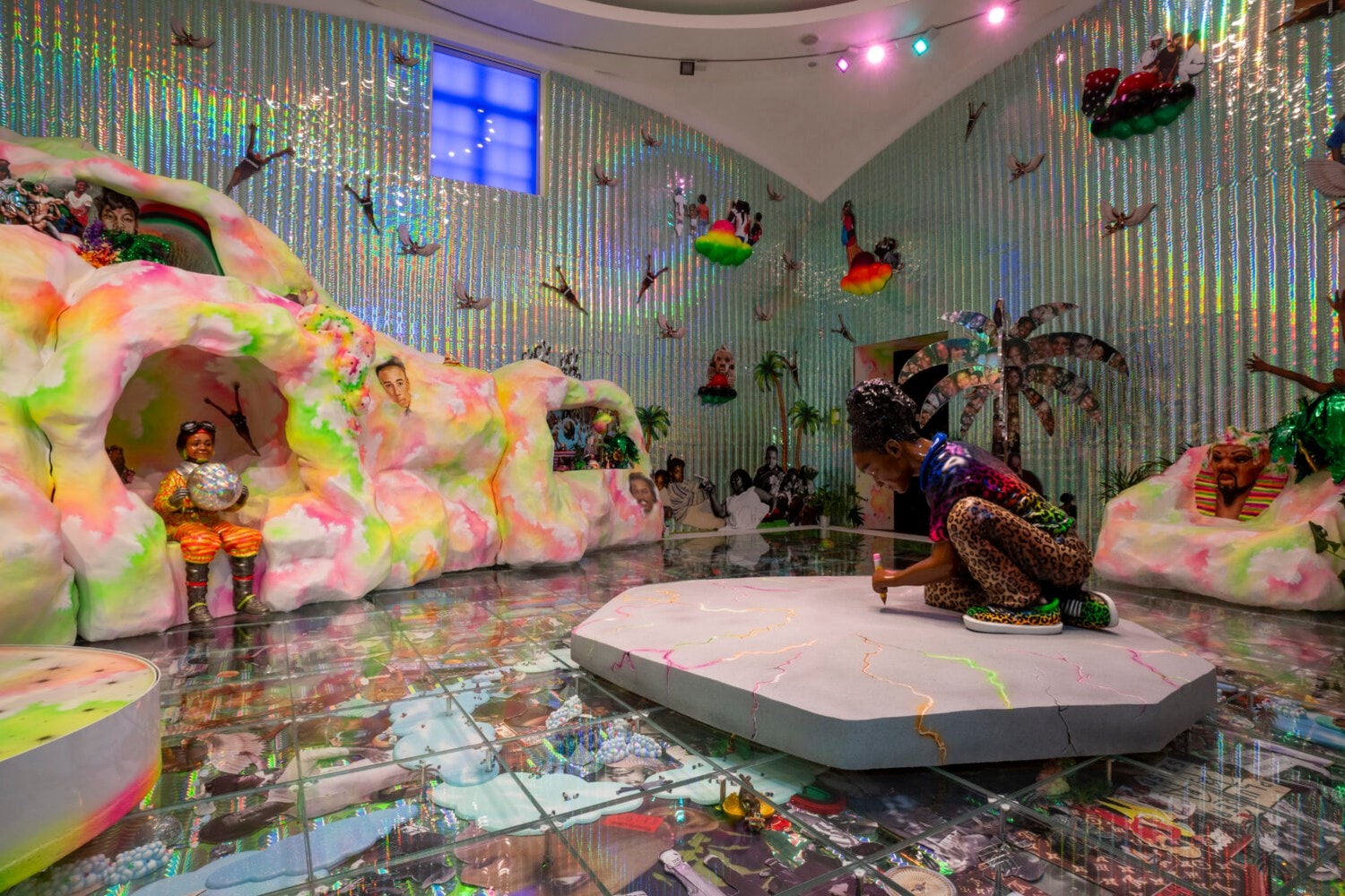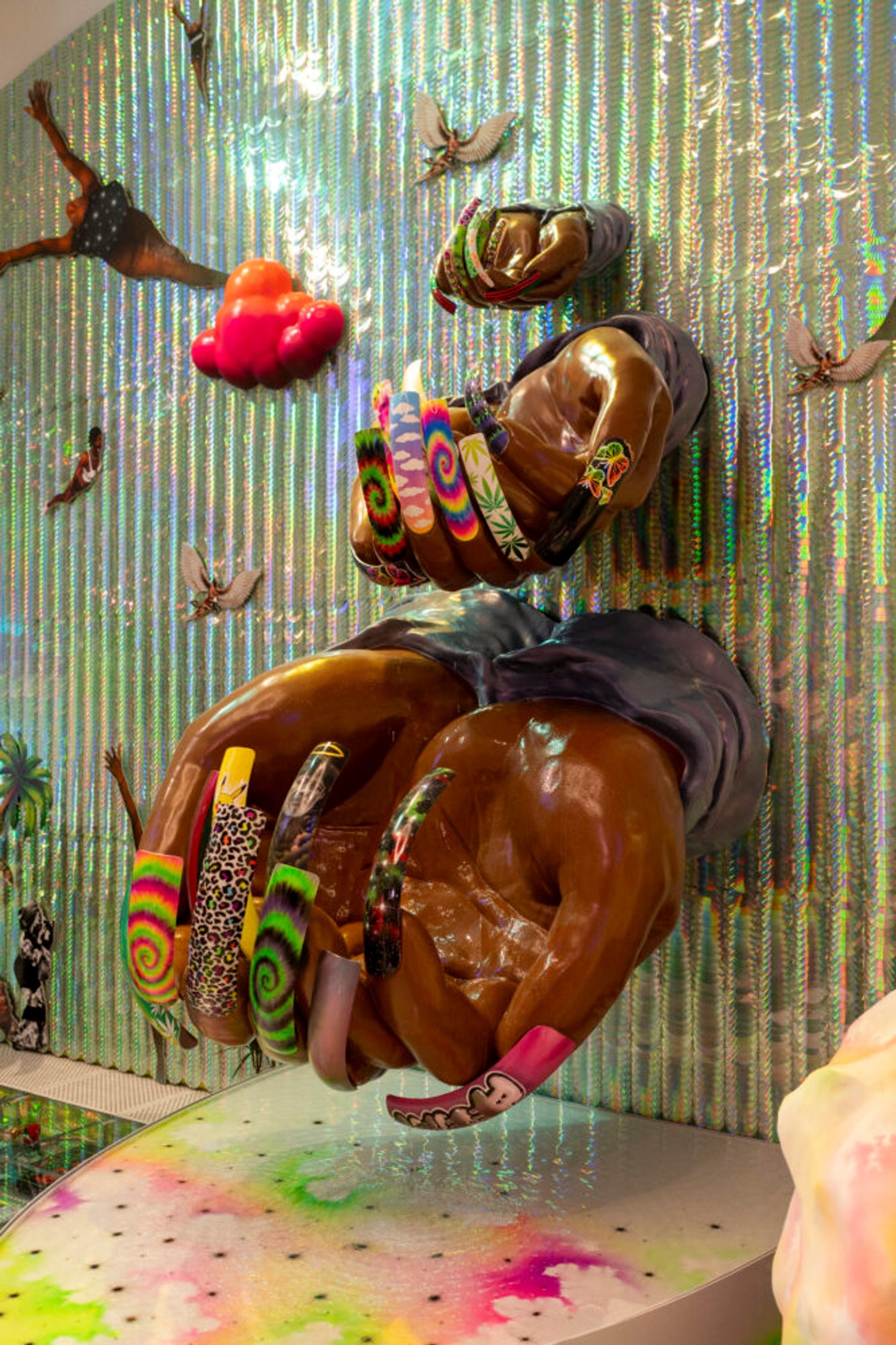 Your cart is emptyemajendat, the artist’s first solo exhibition in the UK, transforms Serpentine South Gallery into an immersive ‘Funk garden’ that responds to the building’s location in Kensington Gardens, offering an extension of the park into the galleries. Central to the exhibition is a life-size version of Halsey’s signature vignettes, usually seen in miniature within sculptures or as intricately arranged tableaux. Here, a prismatic floor and walls made from CD’s provide the setting for scaled-up figurines, funkmounds and sculptures. The artist’s first moving image work is presented alongside sand dunes and a bespoke wallpaper.